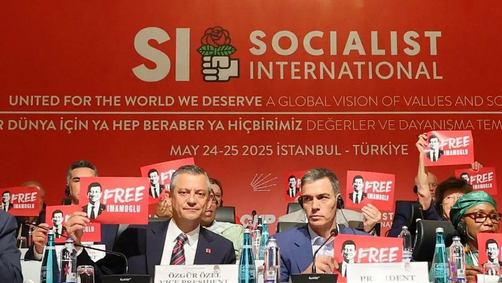 İspanyol Başbakanı Pedro Sánchez Truamp’a rest çekip ‘savaşa hayır’ derken geçen Mayıs ayında Sosyalist Enternasyonal toplantısında elinde “Free İmamoğlu” posteri vardı.